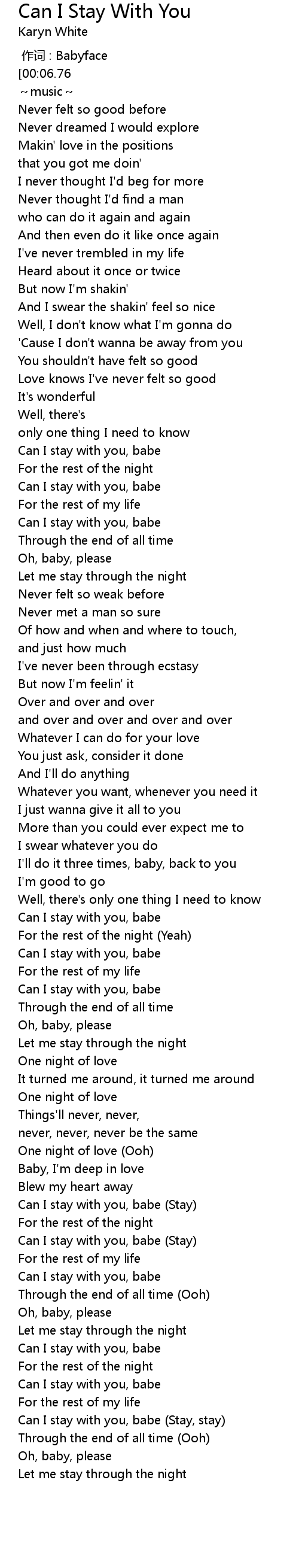 | [04:17.79] | Can I stay with you, babe Stay |