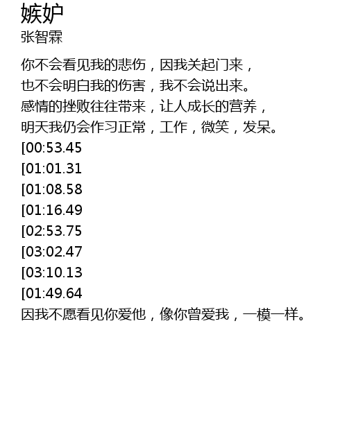 | [03:19.12][01:49.64] | 因我不愿看见你爱他,像当初你曾爱我,一模一样。 |