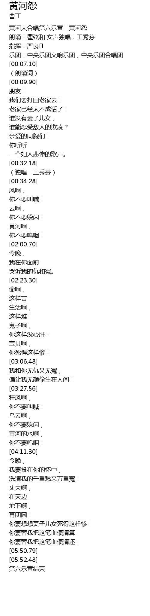 | [00:00.01] | 黄河大合唱第六乐章:黄河怨 |