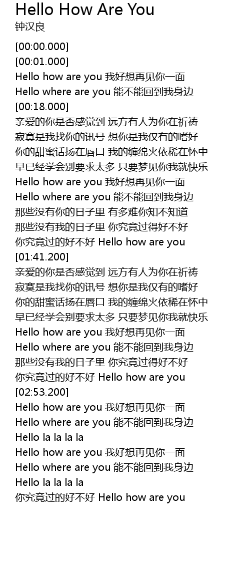 | [01:03.200] | Hello how are you 我好想再见你一面 |