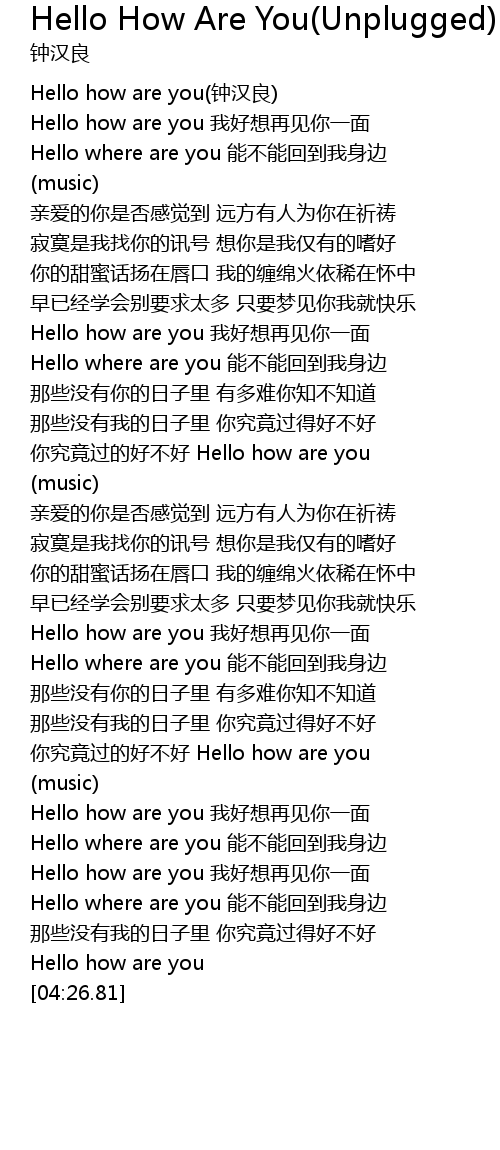 | [01:09.53] | Hello how are you wo hao xiang zai jian ni yi mian |