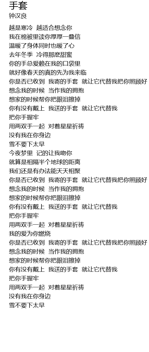 | [02:54.62] | 你有没有戴上 我送的手套 就让它代替我 把你手握牢 |