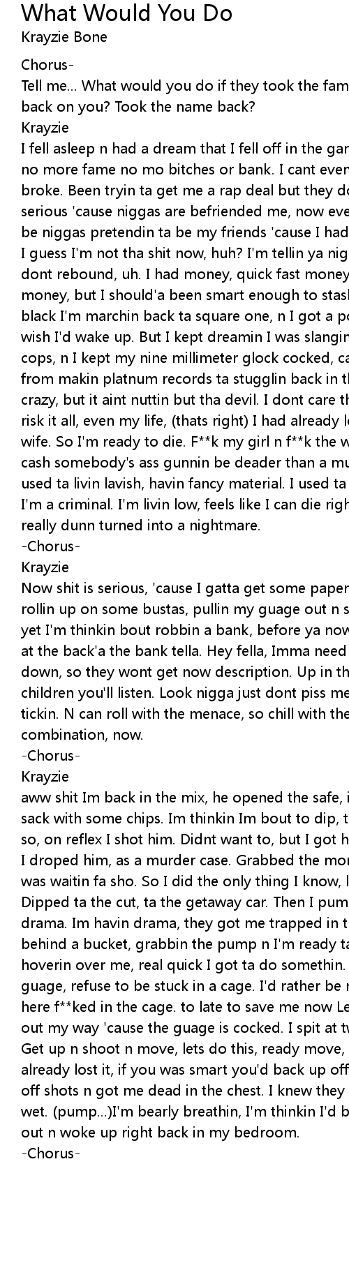 I fell asleep n had a dream that I fell off in the game, nigga no more glammer, no more fame no mo bitches or bank. I cant even buy me a 50 sack 'cause Im broke. Been tryin ta get me a rap deal but they dont love me no mo. Now its serious 'cause niggas are befriended me, now everybody my enemy. Could it really be niggas pretendin ta be my friends 'cause I had the dividends? As I really did I guess I'm not tha shit now, huh? I'm tellin ya niggas ya better hope that I dont rebound, uh. I had money, quick fast money, the cash money, I flashed money, but I should'a been smart enough to stash money. Now I'm back on the black I'm marchin back ta square one, n I got a pocket full'a stones, damn I wish I'd wake up. But I kept dreamin I was slangin rocks, while watchin for cops, n I kept my nine millimeter glock cocked, case it had ta be shot. I went from makin platnum records ta stugglin back in the ghetto. Chasin paper like I'm crazy, but it aint nuttin but tha devil. I dont care though, I was willin ta risk it all, even my life, (thats right) I had already lost it all, even my wife. So I'm ready to die. F**k my girl n f**k the world. If I dont get some cash somebody's ass gunnin be deader than a mutha f**ka n I aint laughin. I'm used ta livin lavish, havin fancy material. I used ta be a rapper, but shit now I'm a criminal. I'm livin low, feels like I can die right here. This dream really dunn turned into a nightmare. |