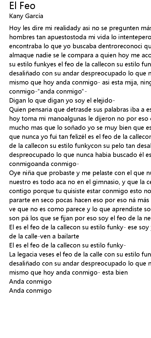 | Quien pensaria que detrasde sus palabras iba a estaresa creacio n del cielo que hoy toma mi manoalgunas le dijeron no por eso cuando dije si me ha sido fiel y mucho mas que lo so ado yo se muy bien que este amor durara para siempre creo que nunca yo fui tan felize l es el feo de la callecon su estilo funkyes el feo de la callecon su estilo funkycon su pelo tan desali ado con su andar despreocupado lo que nunca habia buscado e l es el mismo que hoy anda conmigoanda conmigo | |