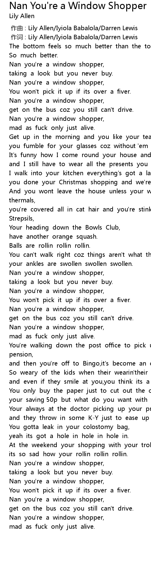 | [00:01.00] | 作词 : Lily Allen/Iyiola Babalola/Darren Lewis |