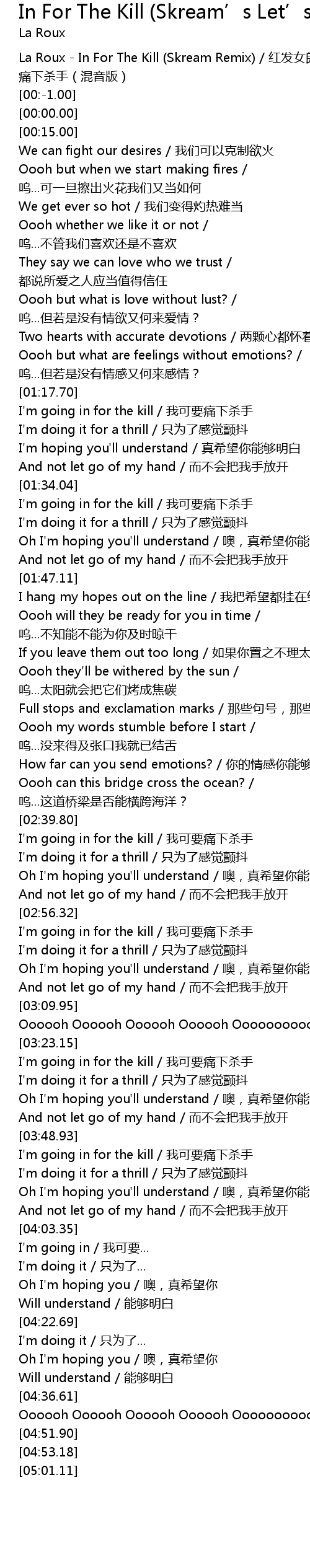 | [00:-2.00] | La Roux In For The Kill Skream Remix hong fa nv lang yue dui tong xia sha shou hun yin ban |