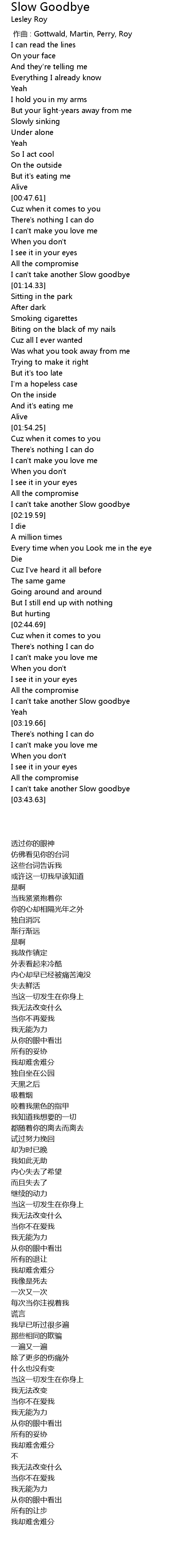 | [03:35.44] | I can' t take another Slow goodbye |