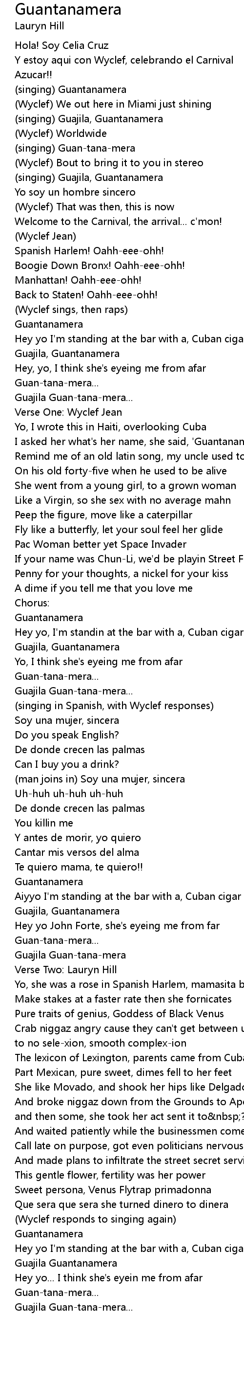 (singing in Spanish, with Wyclef responses) |