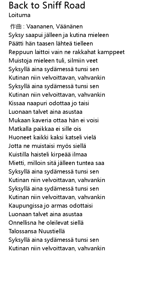 | [01:28.02] | Kuistilla haisteli kirpeää ilmaa |