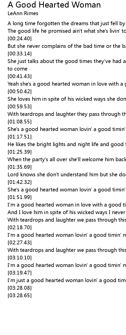 She's a good hearted woman lovin' a good timin' man |