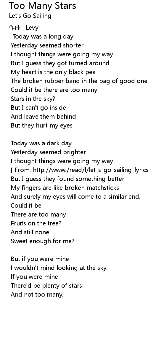 | [ From: http://www./read/l/let_s-go-sailing-lyrics/too-many-stars-lyrics.html ] | |