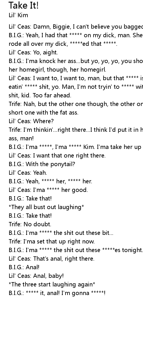 | B.I.G.: I'ma *****, I'ma ***** Kim. I'ma take her up in her room... | |