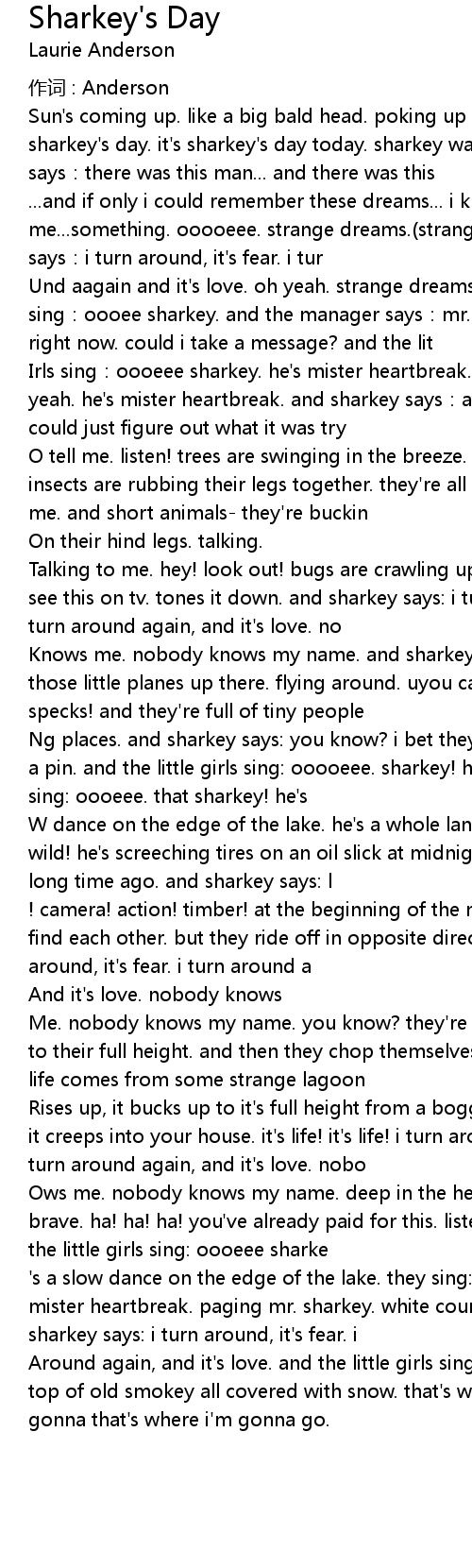 | Und aagain and it's love. oh yeah. strange dreams. and the little girls sing:oooee sharkey. and the manager says:mr. sharkey? he's not at his desk right now. could i take a message? and the lit | |