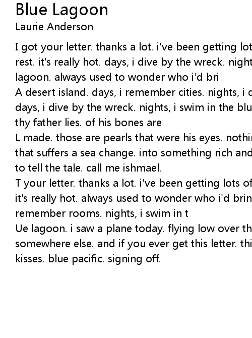 I got your letter. thanks a lot. i've been getting lots of sun. and lots of rest. it's really hot. days, i dive by the wreck. nights, i swim in the blue lagoon. always used to wonder who i'd bri |