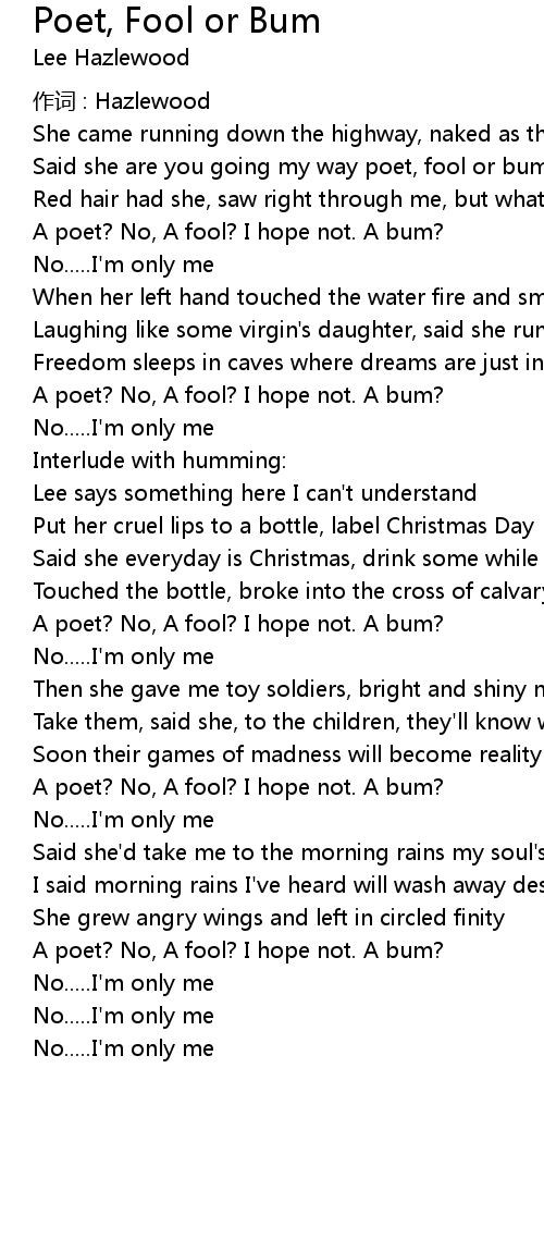 | Said she are you going my way poet, fool or bum | |