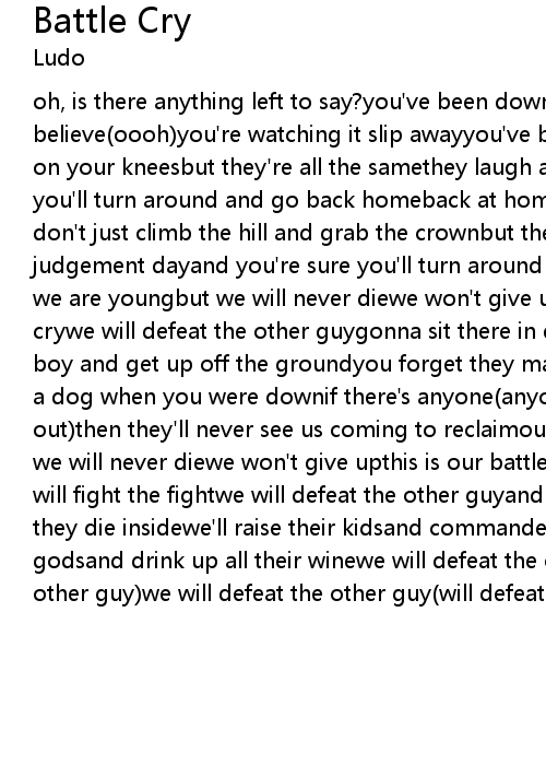 oh, is there anything left to say?you've been down so long you've forgotten to believe(oooh)you're watching it slip awayyou've been kicked around, they got you on your kneesbut they're all the samethey laugh and walk awayand they think you'll turn around and go back homeback at homethey said you'd never winyou don't just climb the hill and grab the crownbut they're all the samescared of judgement dayand you're sure you'll turn around and go back homebut noooo[chorus]we are youngbut we will never diewe won't give upthis is our battle crywe will defeat the other guygonna sit there in defeatyou better suck it up boy and get up off the groundyou forget they made you bleedthey kicked you like a dog when you were downif there's anyone(anyone)looking out above(looking out)then they'll never see us coming to reclaimour glorious daywe are youngbut we will never diewe won't give upthis is our battle crywe dream the dreamsnow we will fight the fightwe will defeat the other guyand they'll lead the dreamsuntil they die insidewe'll raise their kidsand commandeer their wiveswe'll curse their godsand drink up all their winewe will defeat the other guy(will defeat the other guy)we will defeat the other guy(will defeat the other guy) |