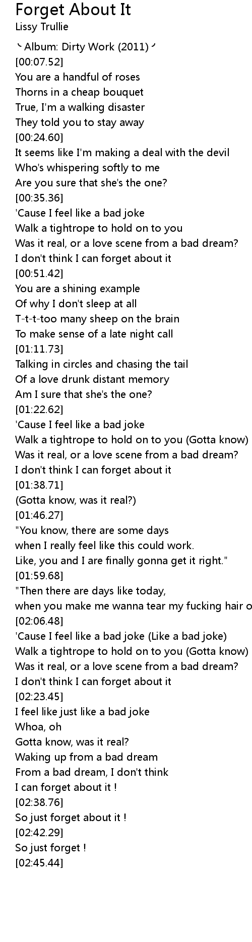 | [00:35.98] | ' Cause I feel like a bad joke |