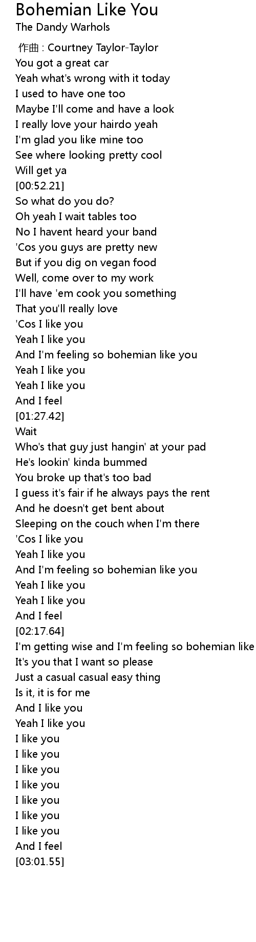 | [02:08.78] | And I'm feeling so bohemian like you |