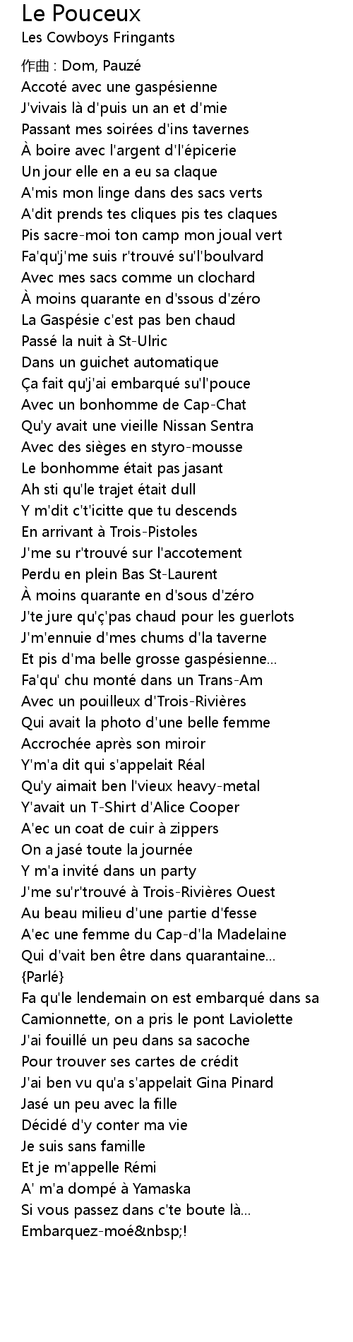 | Ça fait qu'j'ai embarqué su'l'pouce | |