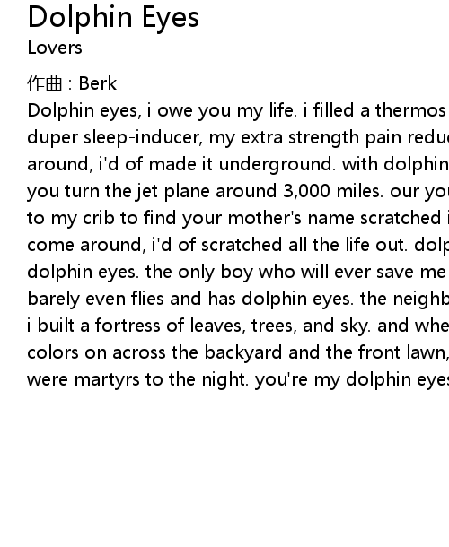 | Dolphin eyes, i owe you my life. i filled a thermos up with turpentine. my super duper sleepinducer, my extra strength pain reducer. and if you hadn' t come around, i' d of made it underground. with dolphin eyes and the sigh that smiles, you turn the jet plane around 3, 000 miles. our younger days, you' d come crawling to my crib to find your mother' s name scratched into my wrist. and if you hadn' t come around, i' d of scratched all the life out. dolphin eyes. dolphin eyes. dolphin eyes. the only boy who will ever save me has a space _ sister sometimes barely even flies and has dolphin eyes. the neighborhood kids watched as you and i built a fortress of leaves, trees, and sky. and when the sunset cast its colors on across the backyard and the front lawn, we made an effigy of _ and were martyrs to the night. you' re my dolphin eyes. |