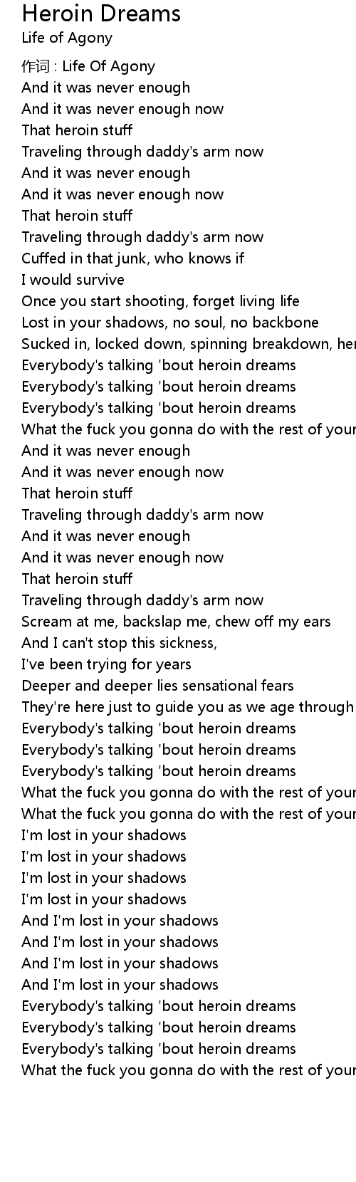 | Sucked in, locked down, spinning breakdown, heroin whores | |