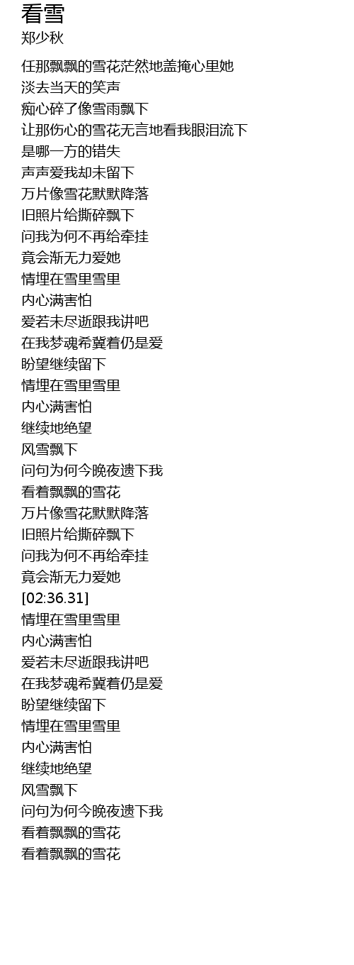 | [00:27.19] | 任那飘飘的雪花茫然地盖掩心里她 |