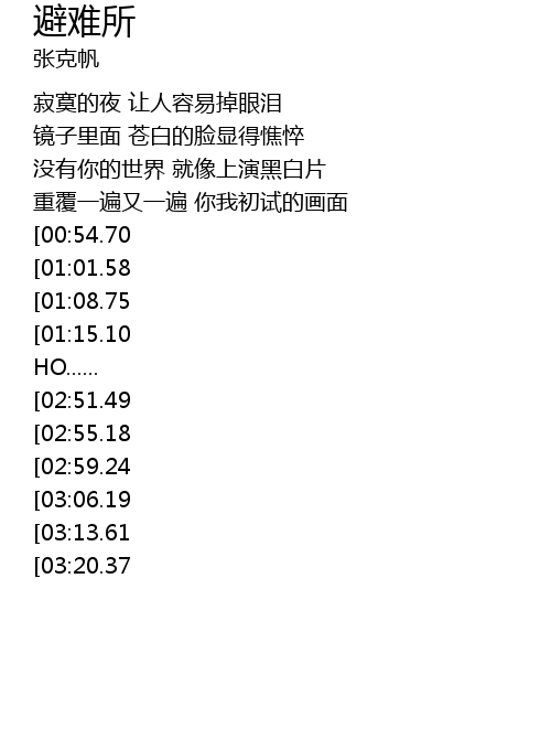| [03:59.77][03:20.37][01:54.03] | zuò nǐ yī bèi zi de bì nàn suǒ |