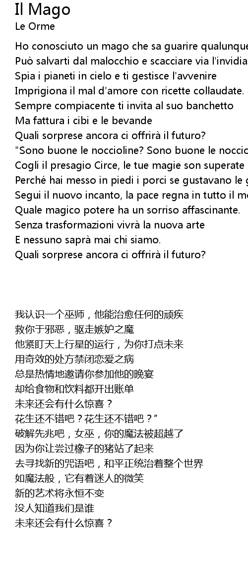 | [00:34.13] | Ho conosciuto un mago che sa guarire qualunque male, |
