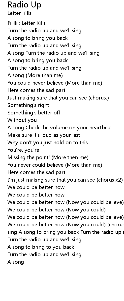 | We could be better now Now you could chorus x3 Turn the radio up and we' ll sing A song to bring you back Turn the radio up and we' ll sing A song A song | |