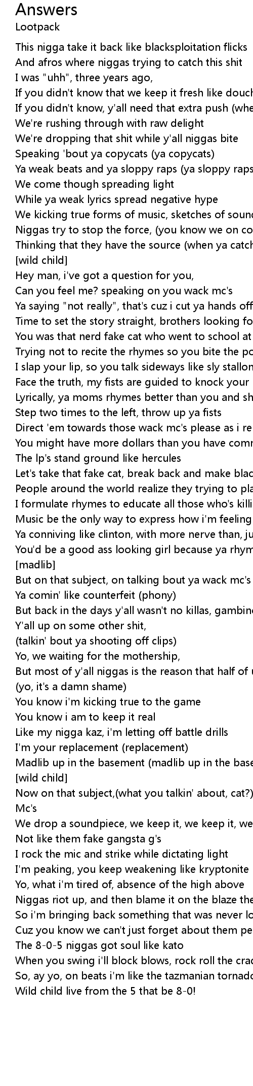 Now on that subject,(what you talkin' about, cat?) talking 'bout ya wack |