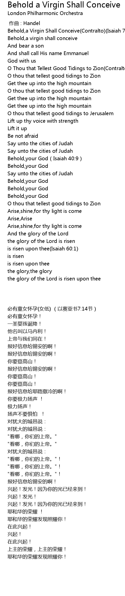 | [00:00.00] | Behold,a Virgin Shall Conceive(Contralto)(Isaiah 7:14) |
