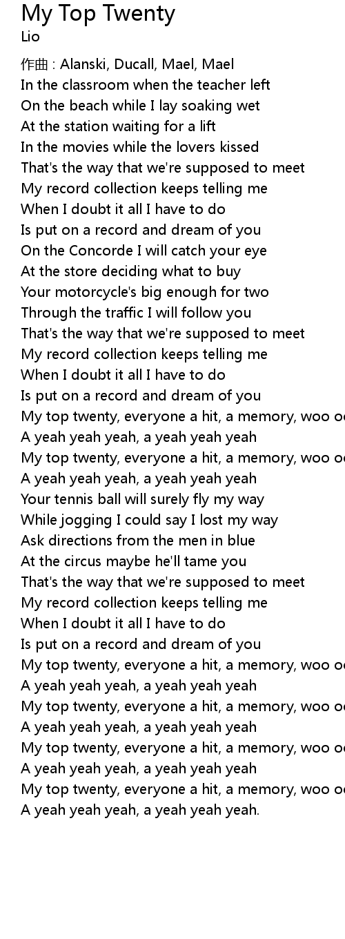 | My top twenty, everyone a hit, a memory, woo oo, woo oo | |