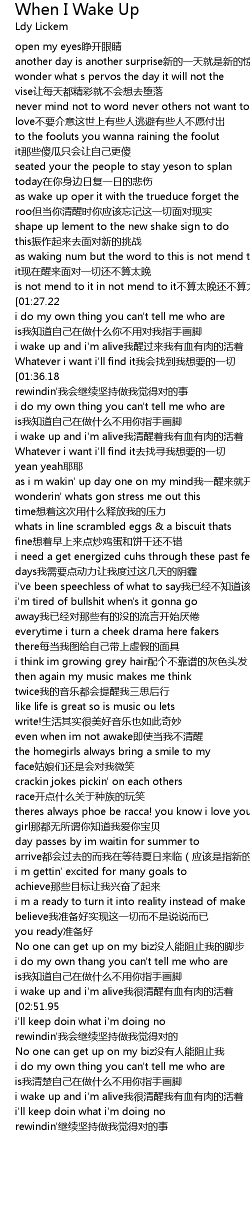 | [01:32.18] | i wake up and i' m alive wǒ qīng xǐng zhe wǒ yǒu xuè yǒu ròu de huó zhe |