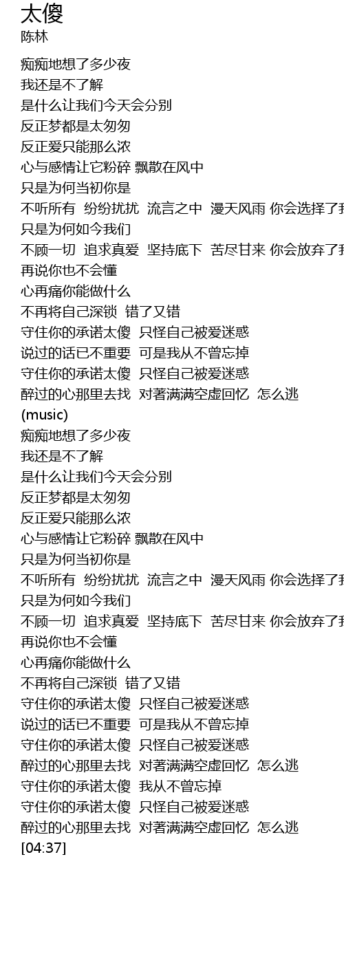 | [04:15] | 守住你的承诺太傻 只怪自己被爱迷惑 |