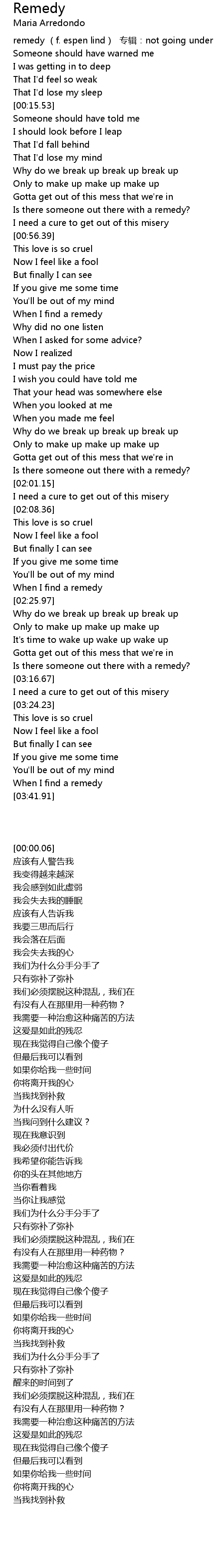 | [00:00.06] | remedy (f. espen lind) 专辑:not going under |