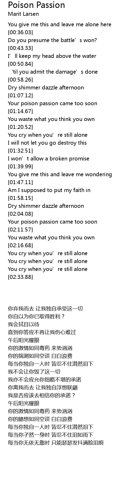 | [02:06.20] | Your poison passion came too soon |
