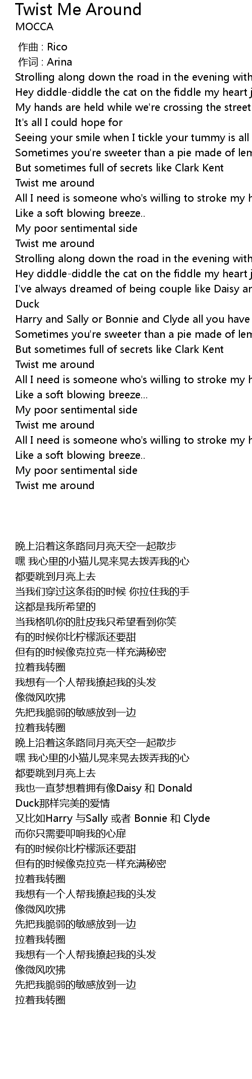 | [02:11.68] | Hey diddlediddle the cat on the fiddle my heart jumps over the moon |