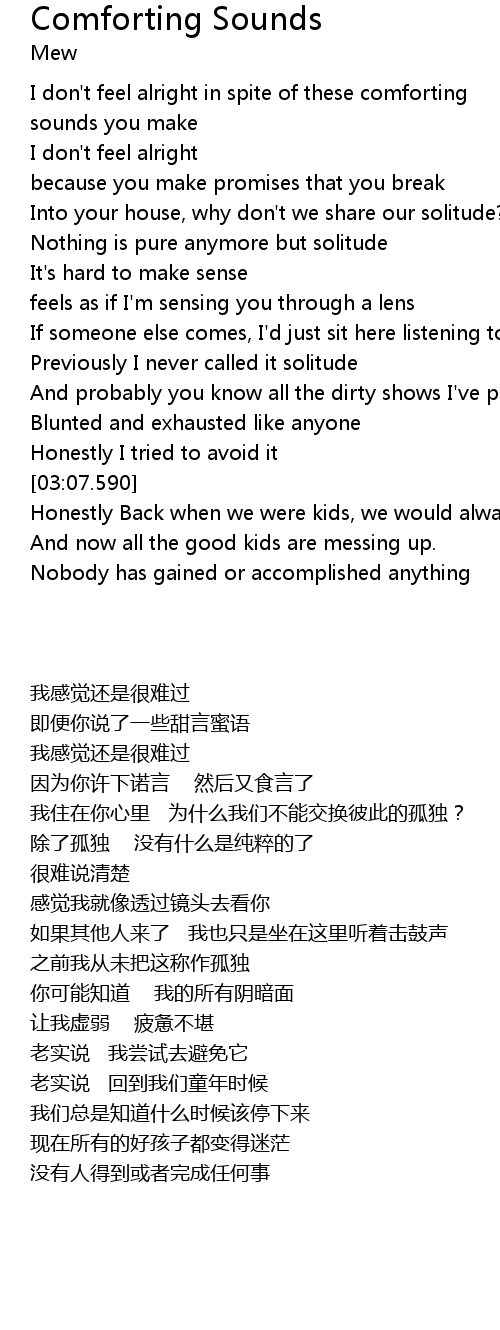 | [00:47.250] | I don't feel alright in spite of these comforting |