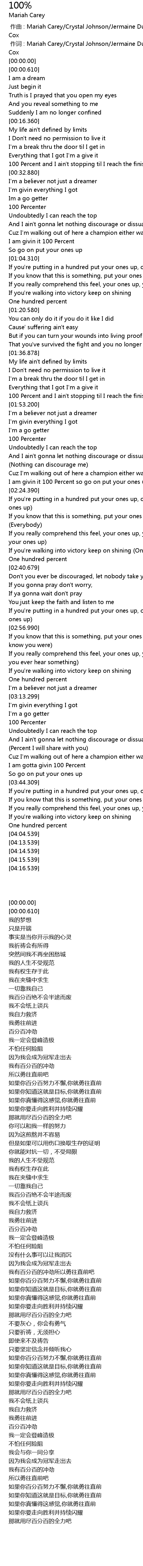 | [01:44.670] | 100 Percent and I ain't stopping til I reach the finish |