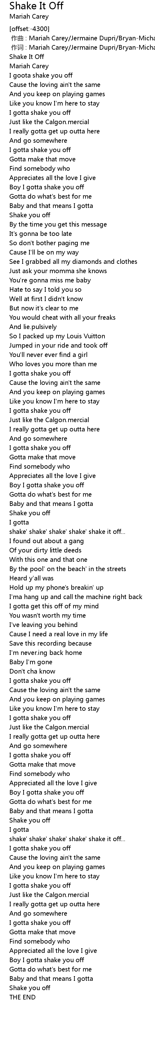 | [02:52.17] | shake' shake' shake' shake' shake it off... |