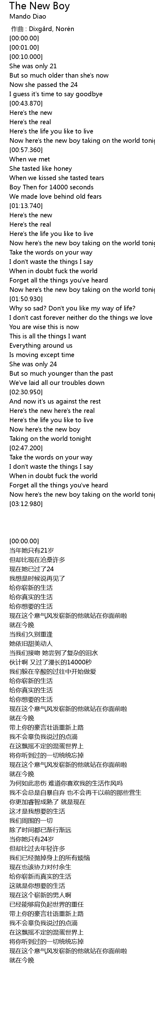 | [00:51.630] | Now here's the new boy taking on the world tonight |