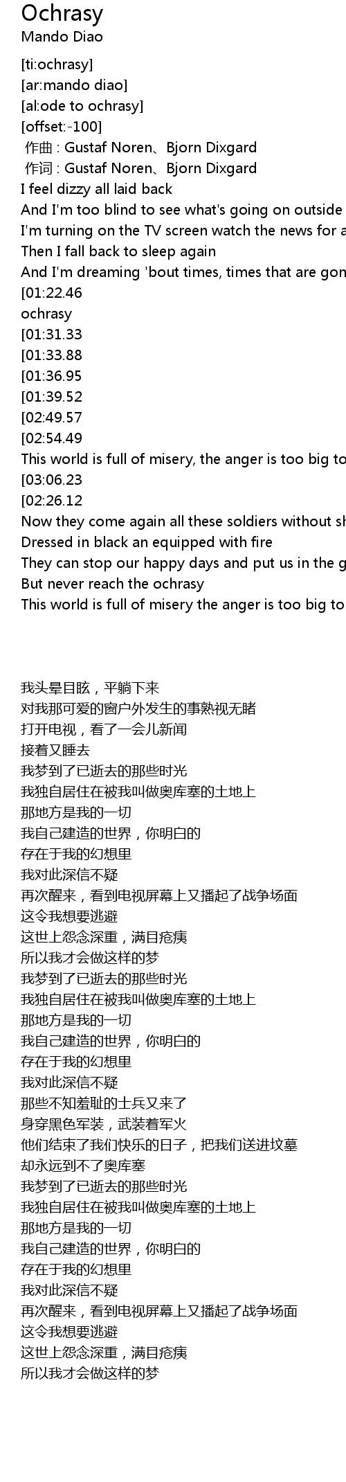 | [00:37.29][01:22.46][02:29.25] | Times when I lived alone in my own land called ochrasy |