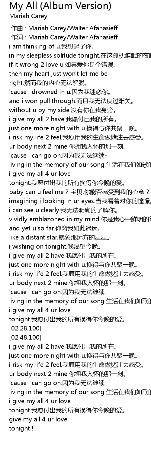 | [03:19.340] | i give my all 4 ur love tonight. wǒ yuàn fù chū wǒ de suǒ yǒu huàn dé nǐ jīn wǎn de ài. |