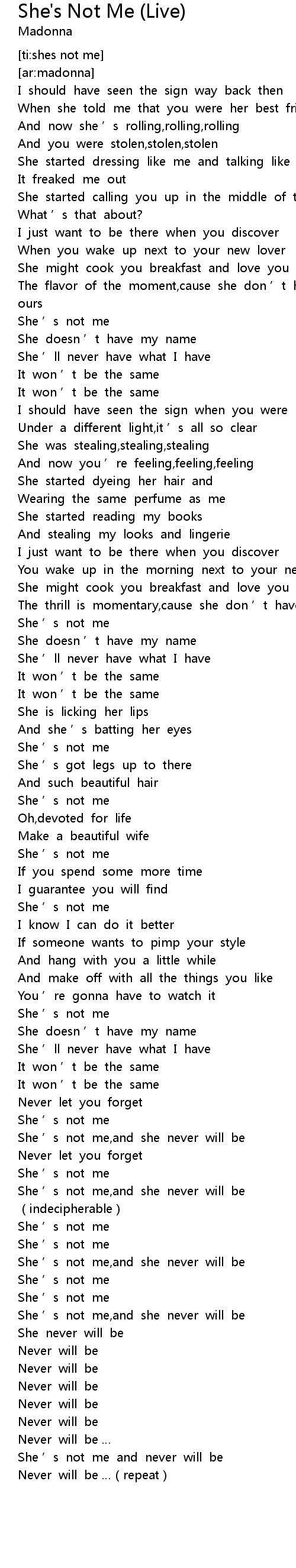 | [03:33.42] | She ' s not me, and she never will be |