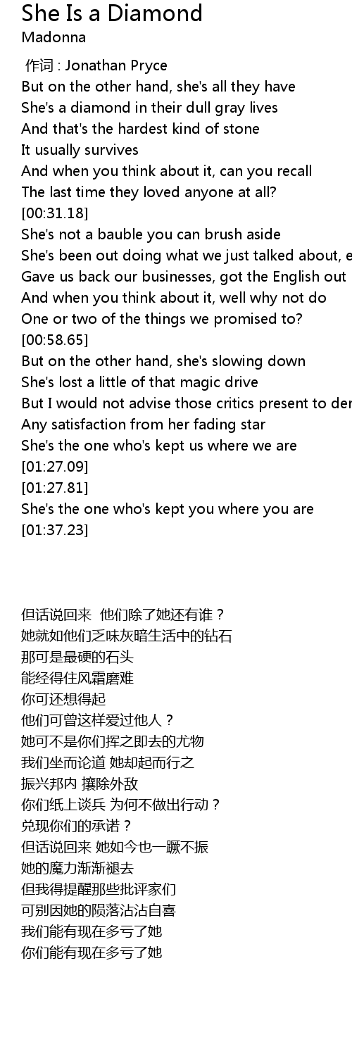 | [00:08.47] | She's a diamond in their dull gray lives |