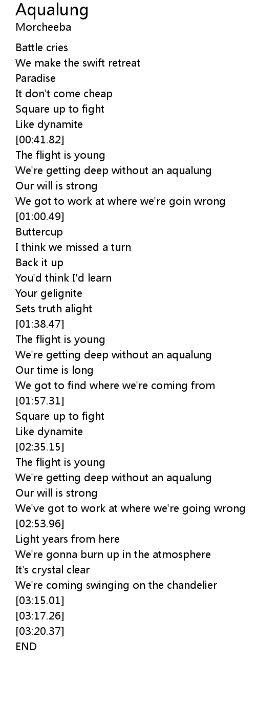| [02:59.29] | We're gonna burn up in the atmosphere |