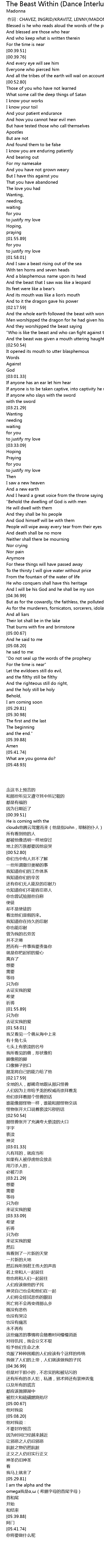 | [01:59.99] | And I saw a beast rising out of the sea |