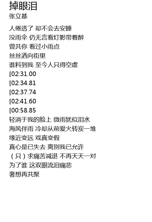 | [02:44.66][02:31.00][01:37.08][00:43.26] | 到底为甚寂寞掉眼泪 |