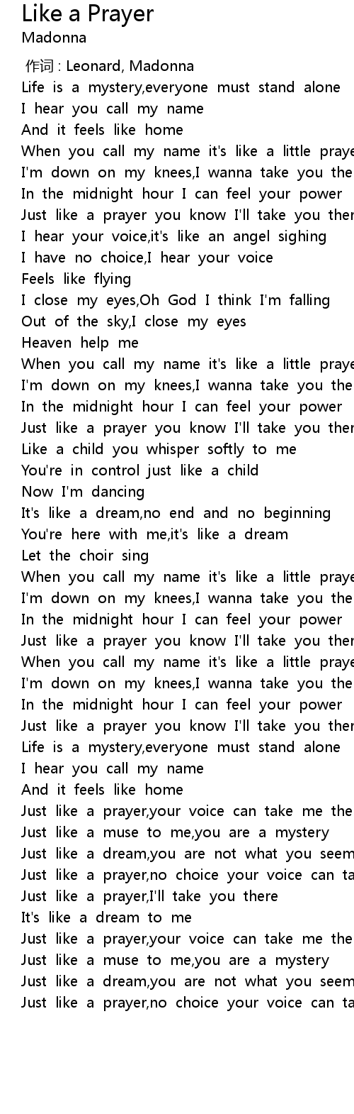 | [04:27.133] | Just like a prayer,no choice your voice can take me there |