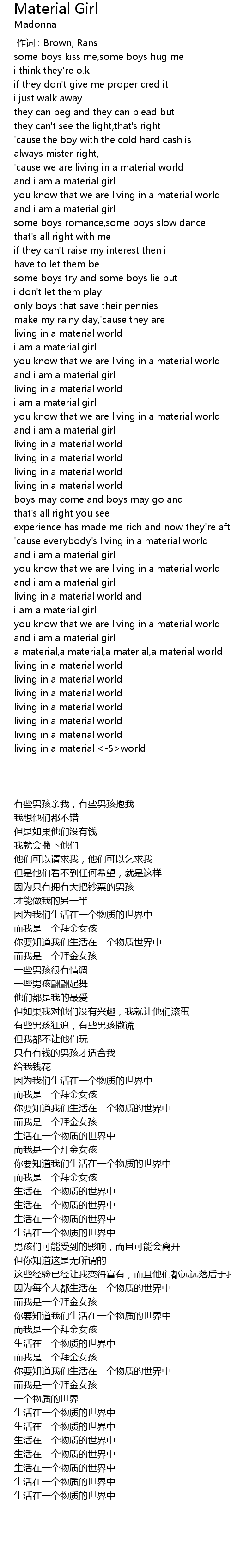 | [03:25.390] | a material,a material,a material,a material world |